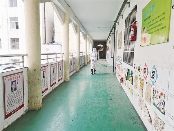 为确保学生“平安开学、开学平安”,我市各中小学校严格落实疫情防控要求,制订春季开学疫情防控工作方案,采取有力措施,切实做好迎接学生安全返校各项工作。图为周口市回民小学组织人员对学校教室、办公室、功能室等进行全面消杀。