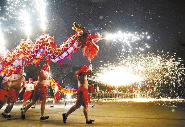 2月14日,在河南省洛阳市洛龙区隋唐城遗址植物园,民俗艺人为市民、游客表演舞龙和“打铁花”,喜迎元宵佳节。新华社记者 郝源 摄