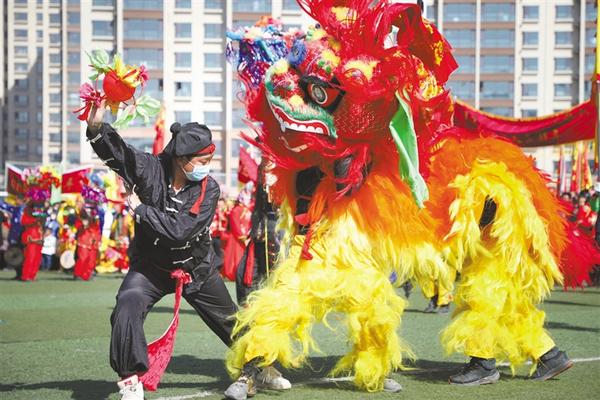 2月15日,甘肃省定西市渭源县的社火演员在表演舞狮。 新华社记者 马希平 摄
