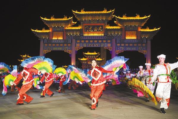 2月14日,演员在进行秧歌表演。元宵节期间,宁夏盐池县开展龙门祈福游九曲系列元宵节民俗文化活动,吸引众多百姓前来参观体验。 新华社记者 王鹏 摄