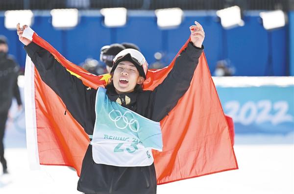 2月15日,中国选手苏翊鸣在比赛后庆祝。