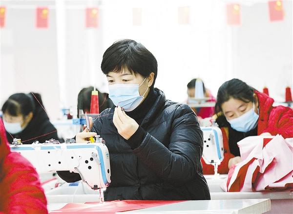2月16日,农历正月十六日,在周口市经济开发区产业园,由返乡创业的周口打工妹岳丽娜创办的河南省智慧树服饰有限公司复工复产。图为将孩子送入学校的女工正在生产车间里紧张工作。记者 梁照曾 摄