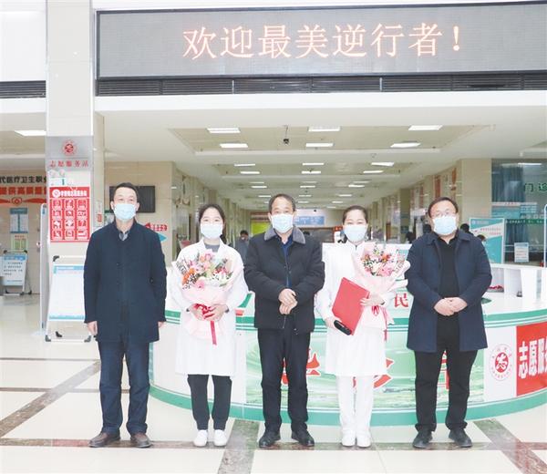 图为该院为凯旋的抗疫“姐妹花”举行欢迎仪式(左二为宋雅倩、右二为兰文佳)。