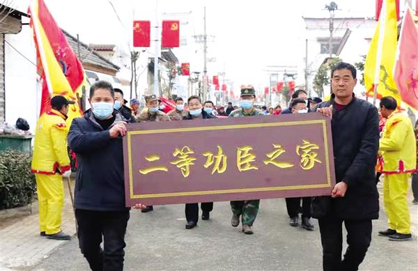在红花集镇杜岗村,二等功臣李浩宾家门前锣鼓喧天,喜气洋洋,农家小院内挤满了前来观看的乡亲们。当涂友佳、龚坤敬、张翼飞等人为李浩宾的父母李秋喜、宋春霞披上红绶带,递上喜报时,现场响起了热烈的掌声。大家纷纷夸奖李家的儿郎有出息,为家乡父老乡亲争了光添了彩。闻听李浩宾的弟弟李亚斌4年前也像哥哥一样报名参军入伍,志愿到拉萨边防某部服役,3次受到部队表彰奖励,涂友佳直夸兄弟二人都是好样的。并嘱咐随行的乡镇领导,一定要及时解决好军人军属家庭的困难,以实际行动解除现役官兵的后顾之忧,鼓励他们再接再厉,再立新功。