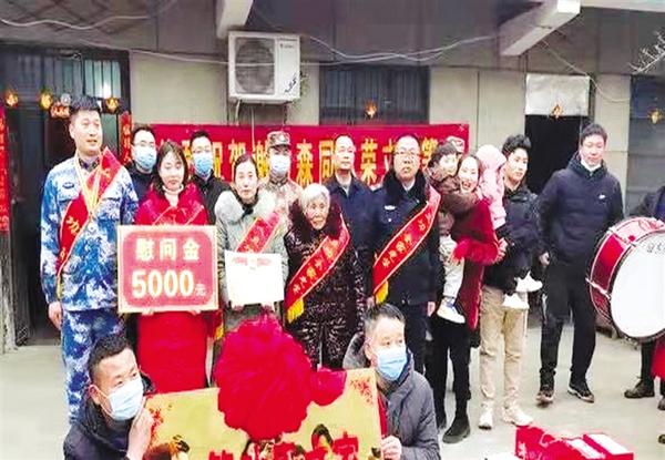 本报讯(通讯员 周昭文/图)近日,沈丘县人武部在老城镇岳庄行政村为荣立二等功的现役军人谢树森举行送喜报仪式,沈丘县委常委、县人武部政委王琰,副县长严坤出席仪式,县人武部、县退役军人事务局相关人员,岳庄行政村干群代表和谢树森家属参加仪式(如图)。