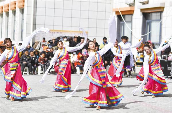 搬迁牧民在搬迁点广场上跳起民族舞蹈,迎接藏历新年(2月28日摄)。