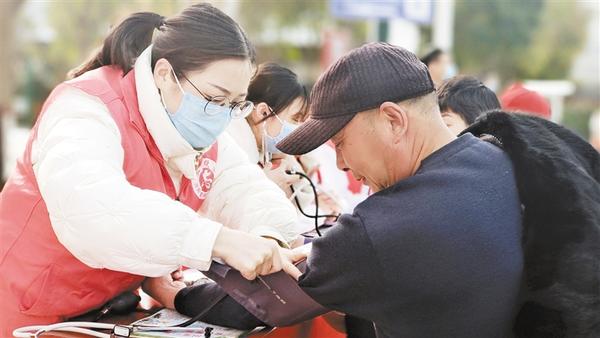 3月1日上午,项城市2022年“新时代文明实践推动周”暨“学雷锋志愿服务月”活动启动仪式结束后,志愿者现场开展了一系列服务关爱行动。图为志愿者在为市民进行义诊。