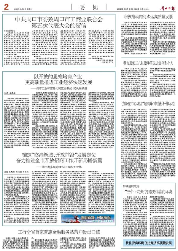 “市委五届二次全会暨市委经济工作会议提出坚持‘临港新城、开放前沿’的发展定位,围绕‘确保高质量建设现代化周口、确保高水平实现现代化周口’,实施‘十大战略’三年行动计划,是践行习近平总书记视察河南‘奋勇争先、更加出彩’的指导思想,是落实省委全会精神的具体举措,是符合周口高质量发展的必由之路,切实体现了市委、市政府对我市发展大势的精准定位、准确把握,为周口工业经济发展找准了出路,真正汇聚了全市人民的共同心愿。”3月6日,市工业和信息化局党组书记、局长张颖波在接受记者采访时表示,开放是当代中国的鲜明标识,是发展进步的必由之路,也是促进疫情之后经济复苏的关键。没有开放的思维就不能适应重塑性变革,没有重塑性变革就不能塑造我市经济发展新优势,全市工信部门将借好这股“东风”,进一步解放思想、精准施策,沿着换道领跑“一四五六”的发展思路,统筹推进传统产业提质增效、新兴产业培育壮大、未来产业前瞻布局,以工业经济提质增效带动全市高质量跨越发展。