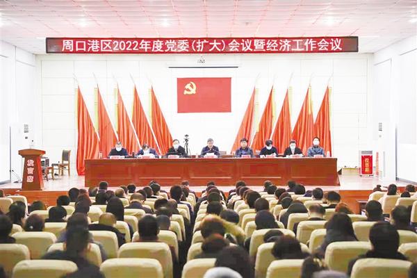 本报讯 (记者 宋风 通讯员 秦辉 石鹏 赵磊 文/图) 2月23日,周口港区召开2022年党委(扩大)会议暨经济工作会议(如图)。会议高举习近平新时代中国特色社会主义思想伟大旗帜,全面贯彻党的十九大和十九届历次全会精神,深入贯彻中央经济工作会议精神、省委十一届二次全会暨省委经济工作会议精神、市委五届二次全会暨市委经济工作会议精神,总结2021年经济工作,分析当前经济形势,部署2022年经济工作,动员港区上下进一步追赶跨越、勇担使命、接续奋斗、砥砺前行,奋力实现今年经济工作开门红、全年红,以优异成绩迎接党的二十大胜利召开。