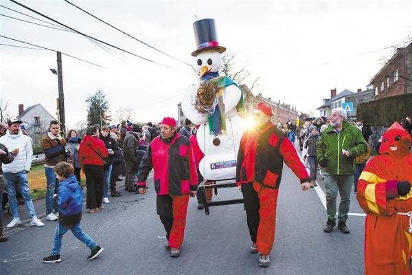 3月6日,在比利时布日,身着传统服饰的当地居民运送象征冬天的“雪人”。3月6日晚,比利时布日举办盛大的篝火仪式。当地居民点燃巨型篝火,烧掉“雪人”,在欢呼和歌唱声中迎接春天。新华社发