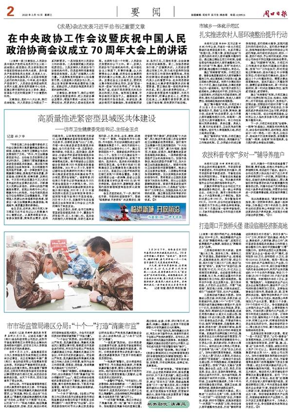 金玉贞说,近年来,周口市深入学习落实习近平总书记以人民健康为中心重要论述,认真贯彻落实中央、省委决策部署,聚焦民生需求,坚持问题导向,以体制机制创新为突破口,以高质量推进紧密型县域医共体为总抓手,创新性实施“53211”工程,市域一体化推进紧密型县域医共体建设,全力打造市县一体、五医联动、数字赋能、中医至上、医防融合、医养结合、分级诊疗的紧密型县域医共体建设“周口模式”,持续推进各项改革举措落地见效。我市郸城县公立医院综合改革获得2020年度国务院督查激励表彰。2021年12月3日,省委书记楼阳生莅周调研时对周口市域一体化推进紧密型医共体建设给予充分肯定,要求全省推广。省委常委、时任周口市委书记安伟被推选为2021年度全国医改十大新闻人物。2021年,全国县域医共体建设新闻发布会推介周口经验,2022年2月10日国务院深化医药卫生体制改革领导小组简报专题刊登周口市医改经验,2022年3月3日,吉建军市长在全国医药卫生体制改革工作会议上代表河南作了典型发言。