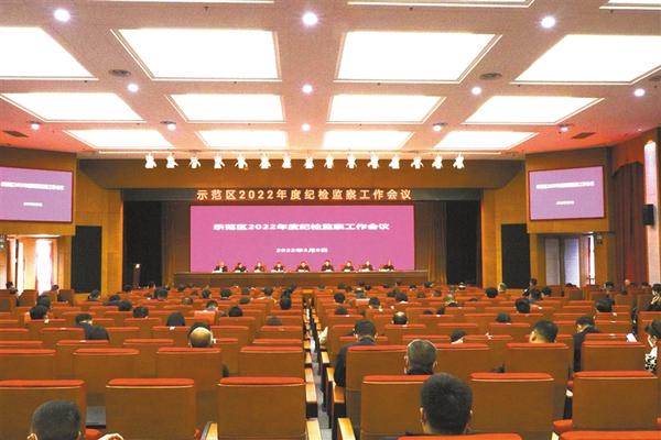 本报讯 (记者 姬慧洋 文/图) 3月9日,市城乡一体化示范区组织召开2022年度纪检监察工作会议。区党工委书记宋力强调,要深入学习贯彻十九届中央纪委六次全会、十一届省纪委二次全会和五届市纪委二次全会精神,落实相关工作部署,坚持不懈把全面从严治党向纵深推进,更加自觉地把管党治党责任扛在肩上、抓在手上,继续打好党风廉政建设和反腐败斗争攻坚战、持久战,为全面开创示范区社会主义现代化建设新局面提供坚强保障。区管委会主任张晓主持会议,区领导王轶、李培华、韩华、丁有亮、何学民、杨宏伟、王学彬参加会议。