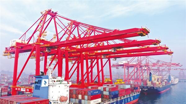 货轮停靠在山东日照港集装箱码头进行装卸作业(1月26日摄,无人机照片)。