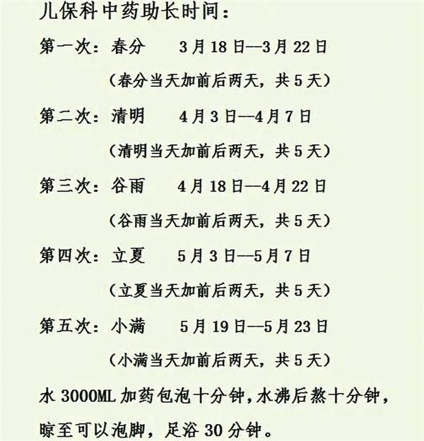 该院儿童保健科负责人介绍,中医讲究“春生夏长,秋收冬藏”。春天阳气生发,是万物生长的季节,人体的新陈代谢旺盛,血液循环加快,呼吸消化功能增强,内分泌激素尤其是生长激素分泌增多,所以,春天也是儿童生长增速的关键时期。如果能把握住孩子长高的黄金时机,适时对孩子进行身高管理,可以起到事半功倍的效果。根据孩子的体质,顺应二十四节气养生保健规律,以疏肝健脾、补肾助运为原则,配以节气助长足浴包,为孩子调理气血、调和脾胃,可明显改善睡眠差、生长缓慢等问题,使孩子增强体质、健康成长。