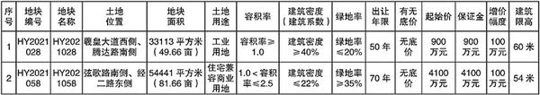 备注:(1)具体建设方案须报规划部门批准后实施,土地出让合同签订后,12个月内必须开工建设,工期30个月,土地成交价款需在土地出让合同签订后60日内交清,交地时间为6个月内。(2)根据淮政【2019】45号文件精神,竞得人摘牌土地后,应将项目施工标发包给在淮阳设立公司的施工单位;房地产开发项目非淮阳境内企业竞买人在竞买申请时,申请书中应明确成立新公司、公司出资构成及成立时间。(3)土地竞买保证金必须以竞买申请人(单位)自身的名义交纳,竞买申请人(单位)与交款人(单位)名称不一致的,无法确认其竞买资格,交纳款项无效。(4)HY2021028宗地为“标准地”出让,“标准地”控制性指标为:入住该宗地的具体产业类型为橡胶和塑料制品业,投资强度不低于260万元/亩,亩均税收不低于6万元/亩;HY2021058宗地为安置保障房用地。(5)具体以规划部门出具的规划指标为准,详见规划设计条件或批复文件。
