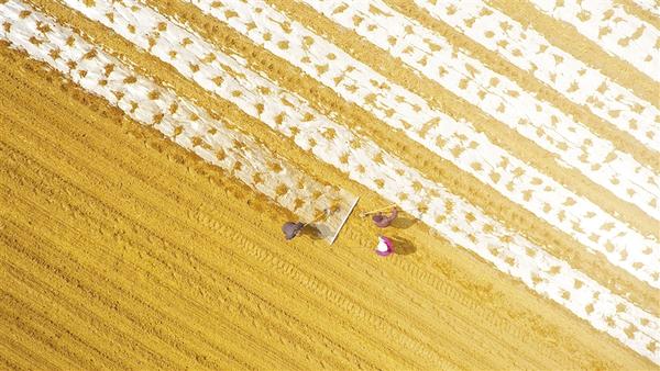 近期,气温回升,天气转暖,各地农民抢抓农时开展农业生产,田间地头一派繁忙景象。① 3月23日,在重庆涪陵美心红酒小镇泡桐村生态农业旅游示范区,村民在葡萄种植基地内驾驶农业机械劳作。② 3月23日,四川省达州市宣汉县黄石乡阳雀村村民在耕田。③ 3月23日,山东省聊城市茌平区贾寨镇前付村村民在田间给种植的花生覆盖地膜(无人机照片)。