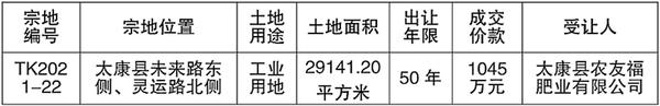 按照《土地管理法》《城市房地产管理法》《招标拍卖挂牌出让国有土地使用权规定》和《招标拍卖挂牌出让国有土地使用权规范》等有关法律法规,遵循公开、公正、公平的原则,太康县自然资源局于2022年3月3日~2022年3月24日拍卖出让1宗国有土地使用权。现将有关情况公示如下: