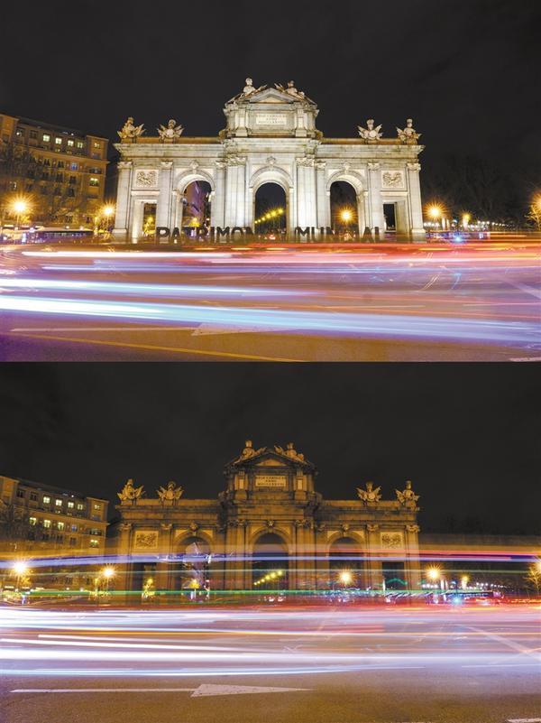 这张拼版照片显示的是,3月26日,位于西班牙马德里的阿尔卡拉门在“地球一小时”开始前(上)后的景象(长时间曝光照片)。