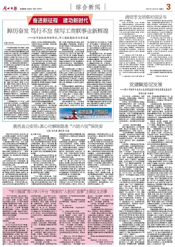 六是开展“争先创优进位行动”,以自身建设树立新形象。以“能力作风建设年”活动的深入开展为契机,以实干创新的精气神固本强基培元,以舍我其谁的责任感争先创优进位,力争在全省系统内拔得头筹、在全市工作中凸显作为。一要加强领导班子建设。加强培训学习,提高领导班子履职能力,开拓工作局面;发挥企业家副主席、副会长作用,建设政治坚定、业务精通、作风优良的领导集体。二要推进县级工商联建设。加强县级工商联工作力量,着力解决基本队伍、基本人手、基本条件、基本保障,支持所有县市区工商联成立民营经济服务中心。三要加强机关干部队伍建设。注重实践锻炼,全面提升民营经济统战干部队伍整体素质,持续锻造服务民营经济“两个健康”和建设现代化新周口的过硬本领,为做好新时代工商联工作、争创一流人民团体提供有力支撑。②11
