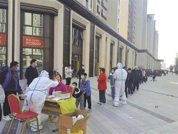 为严防疫情输入,做到“早发现、早报告、早隔离、早治疗”,根据周口市新冠肺炎疫情防控指挥部统一安排部署,3月29日至3月30日,开发区开展全员核酸检测。图为核酸采样现场。 记者 郭坤 通讯员 纪红玉 摄