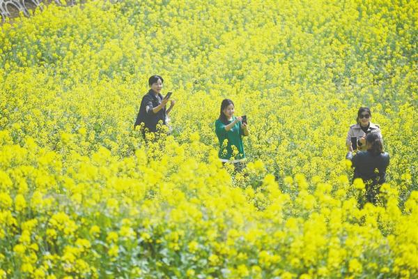 3月29日,游客在杭州市富阳区新登街道潘堰村“海绵农田”的油菜花地里拍照留影。浙江省杭州市富阳区新登街道潘堰村2018年通过土地流转,对千亩低丘缓坡实施土地整理,建造梯田,同时采用防渗水膜节水法,建造地下隐形水库、灌排系统、生态挡土墙系统、田间道路系统等,建成了300亩左右“海绵农田”。新华社记者 徐昱 摄