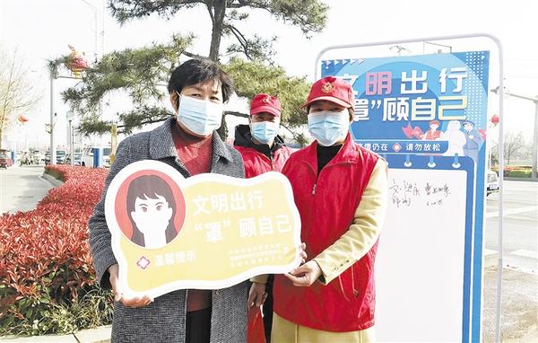 3月29日,在项城市疫情防控执勤点,项城市新时代文明实践中心的志愿者将一只只口罩免费发放给过往行人,提醒他们做好个人防护。 记者 张志新 摄
