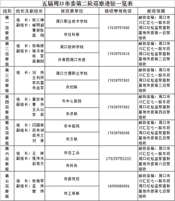 本报讯 按照周口市委统一部署,本轮巡察共派出7个巡察组,对市委党校、市总工会、共青团周口市委、市妇联、市文联、市科协、市社科联、市侨联、市工商联、周口职业技术学院、周口技师学院、周口文理职业学院、市中心医院、市中医院等14家单位党组织开展常规巡察。近日,7个巡察组陆续进驻被巡察单位开展工作。