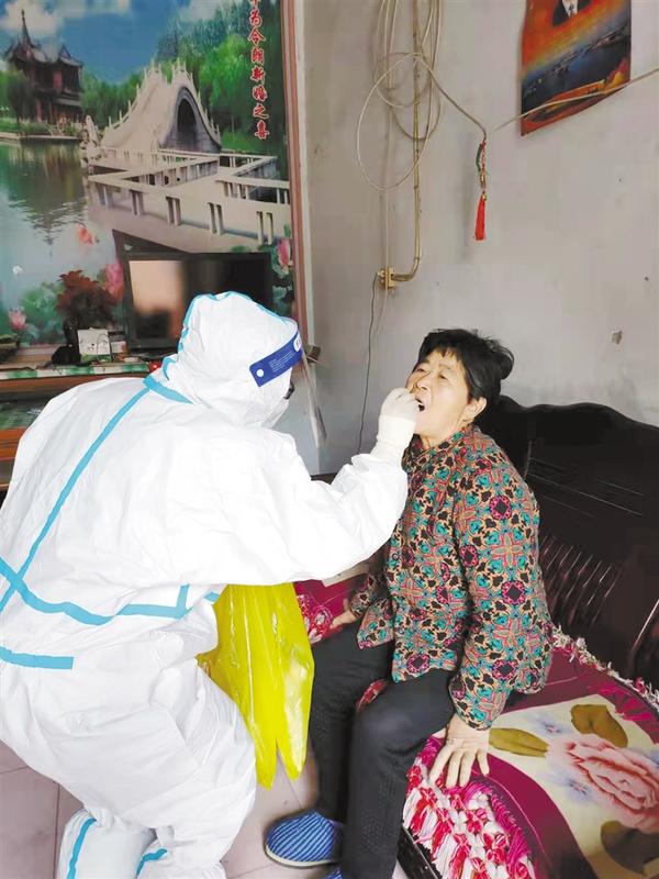 本报讯 (记者 高洪驰 文/图) “为了我一个人还特意跑一趟,政府心里面一直装着我们老百姓哩!”3月30日, 沈丘县付井镇王庄行政村干部带领医护人员走进一位老人家中,帮助老人完成信息登记,引导老人配合完成咽拭子取样(如图)后,老人感慨地说。