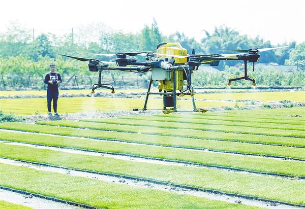4月7日,在四川省眉山市彭山区凤鸣街道金烛村,农技人员正操作植保无人机。当下正逢春耕时节,金烛村田间成片秧盘里的秧苗已冒出新芽,村民们正忙着进行除草等工作,为接下来的机械插秧做准备。 新华社记者 王曦 摄