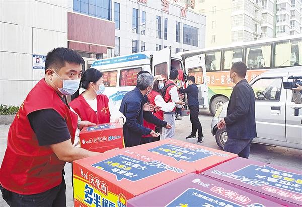 同“周”共济,共战疫情。4月7日,在得知周口市三川社工义工服务中心为一线抗疫医护人员送物资的消息后,周口景园房地产公司、周口市恒宜建筑劳务有限公司、周口市嘉馨物业公司等爱心商家和爱心人士,把一箱箱饱含爱的生活物资送到周口市三川社工义工服务中心,为一线抗疫医护人员送去温暖和关怀,给全市抗击疫情工作鼓劲打气。 记者 窦娜 摄