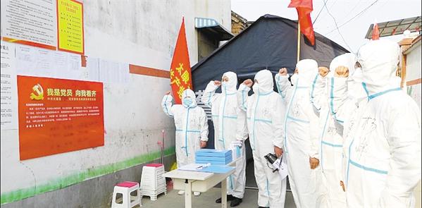疫情防控期间,太康县公安局民警在封控区执勤点庄严宣誓“我是党员我先上”。