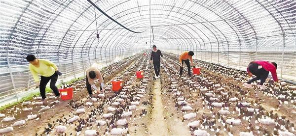 近日,位于扶沟县金城妙月农业园区的25座羊肚菌大棚喜获丰收,预计收益在60万元以上。该园区辐射带动周边多个村庄发展羊肚菌种植产业,为当地乡村振兴注入了新动能。图为工人正在采收羊肚菌。