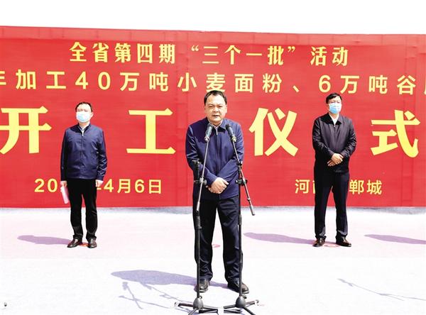 本报讯(记者 徐松 文/图)4月6日,河南省第四期“三个一批”项目建设活动举行。郸城县在分会场与省市同步参加活动,并举行正星粉业有限公司年加工40万吨小麦面粉、6万吨谷朊粉项目开工仪式。县委书记李全林下达开工令(如图),县长董鸿致辞,县委常委、常务副县长宋一兵主持开工仪式,县领导陈强、周俊领、张仁杰、孙怀远等参加活动。