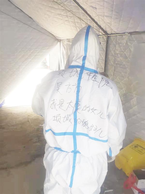 古有大禹治水三过家门而不入,今有白衣天使抗疫三过家门而不进。吴方方的同事特意在她的医护服后面写下这样一句话:“我是太康的女儿,项城的媳妇儿。”