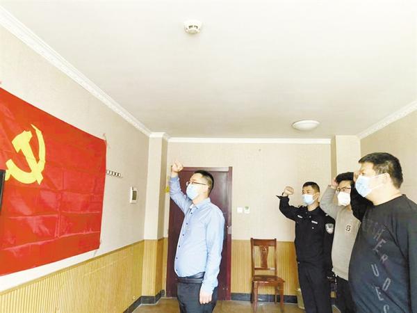 一名党员就是一面旗帜,一个支部就是一座堡垒。为激发工作组人员的工作热情,工作组成立临时党支部,工作组全体人员重温入党誓词(如图)。在对隔离群众中的党员、村干部进行摸底后,发现党员5名,临时党支部要求他们做好自身防护的同时,发挥先进模范作用,积极帮助其他隔离人员做好防护工作。