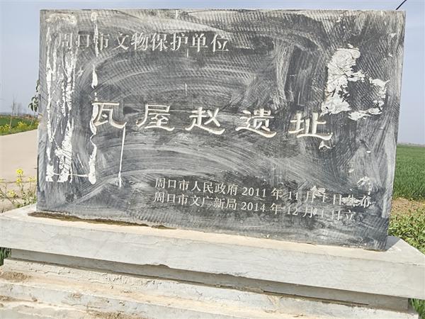 在址坊镇工作人员王耀忠的带领下,记者一行来到该镇瓦屋赵遗址所在地瓦屋赵村,只见这儿屋舍俨然,一排排两层高的楼房整齐排列,金黄的油菜花如明亮的星星点缀在门前屋后,整个村子生机盎然。阡陌小路边,年长者三三两两聚在一起,享受着太阳的温暖,闲聊着今天的幸福生活。难以想象,这个安静美好的村庄竟然属于仰韶文化、大汶口文化、龙山文化遗存。瓦屋赵遗址位于瓦屋赵村北,遗址原为高岗台地,面积6500平方米,文化层厚1米~4米,出土有鸭嘴形鼎足、红陶钵、黑陶罐、粗把豆、灰陶壶等。遗址西部残存一段长20米、宽4米、高3米的周代夯土城垣,具有很高的历史价值。该遗址的发现为研究豫东历史文化发展提供了宝贵的实物资料,被评定为市级文物保护单位。