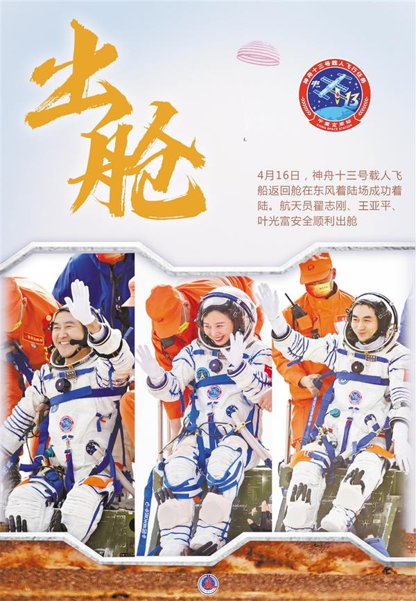 4月16日,神舟十三号载人飞船返回舱在东风着陆场成功着陆。这是航天员翟志刚、王亚平、叶光富(左至右)安全顺利出舱(拼版照片)。