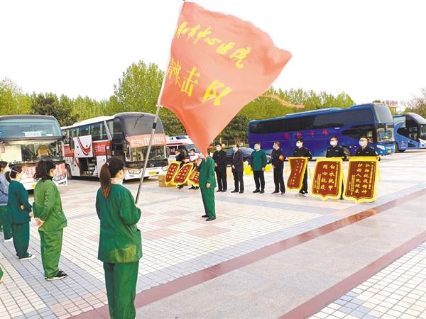 日前,太康县城关镇、符草楼镇相关负责人将写有“白衣执甲 同心抗疫”“守望相助 同心抗疫”字样的锦旗送到支援太康县的周口市中心医院医务人员手中,感谢他们的无私帮助。图为锦旗赠送现场。 记者 张洪涛 摄