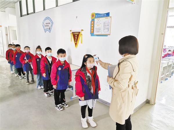 周口市汉阳路学校有序复学,入班前教师对学生进行体温测量。 记者 刘华志 摄