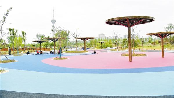 4月28日, 周口沙颍河湿地公园内工人正在游乐场所铺七彩塑胶地面。据施工人员介绍,铺彩色塑胶地面要20多天时间,为了保证施工质量,希望市民在施工期不要进入施工场地。 记者 孙安平 摄