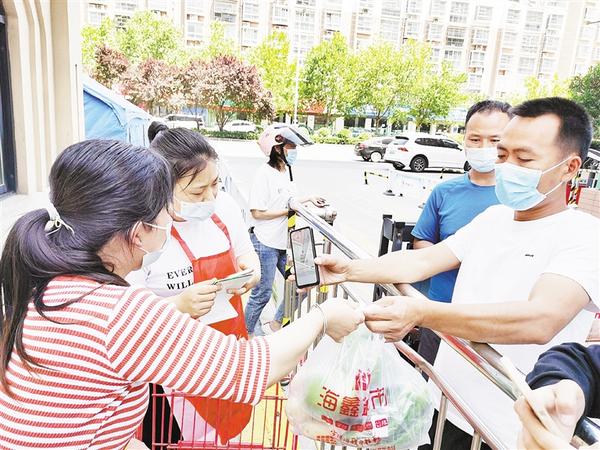 5月6日,市城乡一体化示范区文昌办事处辖区内小区实行封闭管理。该办事处为社区居民公开各社区服务电话及18家生活便民超市、药店电话,切实满足广大居民基本生活需求和特殊需求。图为便民超市工作人员为附近小区居民送生活物资。记者 孙安平 摄