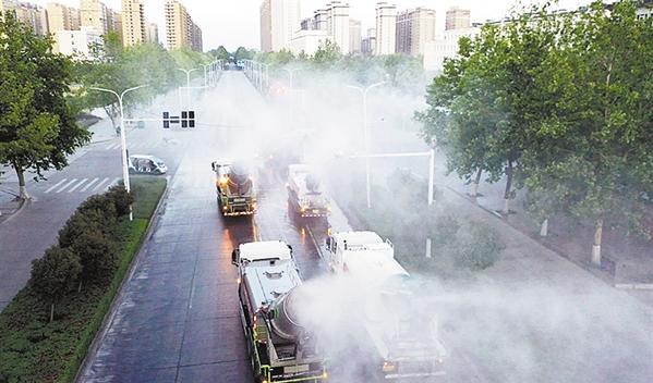 10多台雾炮车两两并行,沿主干道缓慢前行,随之喷洒而出的消毒药水,呈雾状在空气中弥散开来……自5月5日下午开始,根据项城市新冠肺炎疫情防控指挥部安排部署,项城市城管局对该市中心城区主次干道实施环境消毒消杀作业,时间暂定为5月5日至10日。记者 张志新 摄