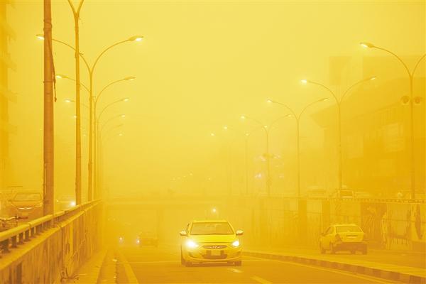 5月1日,在伊拉克巴格达,车辆在沙尘天气中行驶。