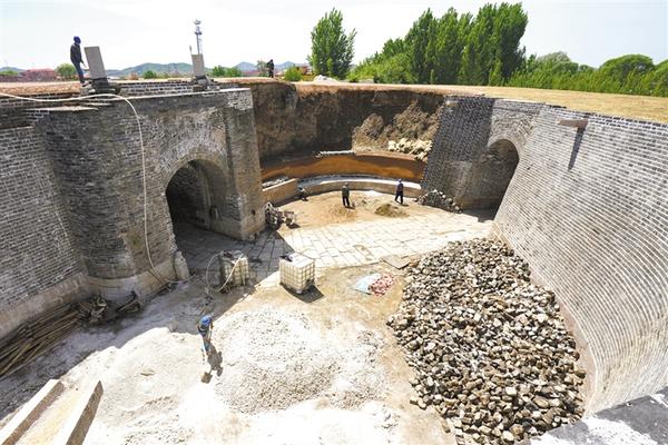 5月7日,工人在秦皇岛市卢龙县城的明代永平府城墙西门瓮城修缮工程现场施工。