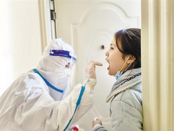 准备医疗物资、到指定地点集合、被社区干部接走……到达社区已7点了。穿上防护服、戴上防护面屏、穿上脚套、戴好橡胶手套,全副武装的秦培培和同事陶金金跟着社区工作人员开始入户采集样本。为节约时间,采集顺序从上至下。电梯到达顶层,敲开房门,居民站在门内,她们站在门外,从出示二维码登记、确认身份到完成采样,前后不到一分钟,离开的时候再喷酒精消毒,细心的她们温暖又有爱。