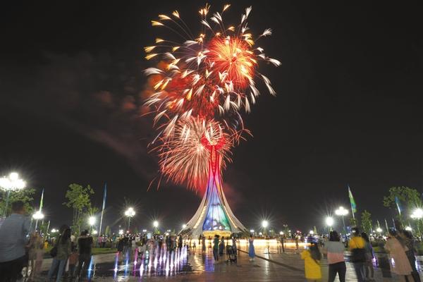 5月9日,烟花在乌兹别克斯坦首都塔什干上空绽放,庆祝“纪念和荣誉日”。