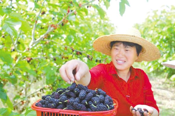 近日,商水城关乡吴楼村桑葚种植园内,村民正在采摘桑葚抢先供应市场。近年来,该县工商联通过鼓励和引导农民种植专业合作社发展桑葚、草莓等特色水果种植,带动近郊生态游,桑葚种植已成为当地农民脱贫致富的“钱串子”。 记者 马治卫 通讯员 刘飞 摄