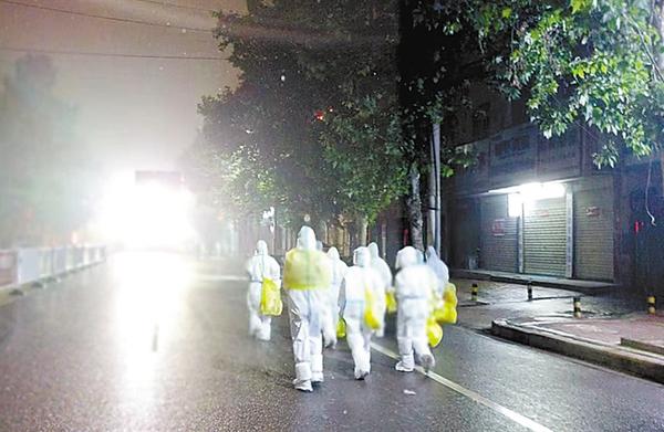 就这样,一支平均年龄不到35岁的年轻生力军应时而生,迅速入驻沁园春隔离点,在抗疫一线树立起青年突击队的鲜红旗帜。他们24小时备战,穿着密不透风的防护服,戴着防护面屏和双层手套,有条不紊地开展紧急采样工作。他们两人为一组,一人负责预检分诊、信息录入核对,一人进行核酸采样。