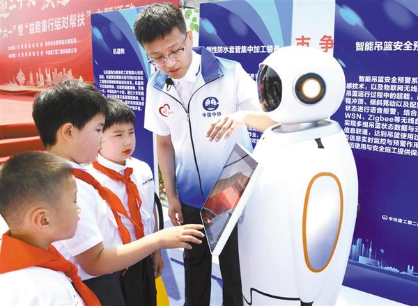 5月29日,中铁建工白沙湾足球基地项目工地,孩子们在与智能机器人互动。