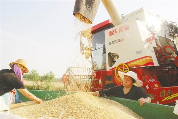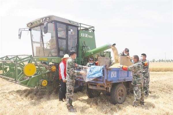 为确保小麦颗粒归仓、丰产丰收,“三夏”期间,沈丘县付井镇成立了93个帮扶小分队,组织94台联合收割机,全力帮助265户因疫情无法返乡的在外务工人员家庭、“五包一”家庭和老弱病残困难户做好夏收夏种工作。图为“三夏”帮扶小分队成员正在帮助群众收麦。记者 高洪驰 摄